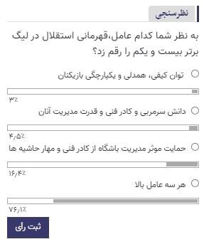 در نظرسنجی خبرآنلاین از شما پرسیده بودیم که کدام عامل نقش مهمتری در قهرمانی این فصل استقلال داشته و در میان گزینهها «توان کیفی، همدلی و یکپارچگی بازیکنان» 3 درصد، «دانش سرمربی و کادر فنی و قدرت مدیریت آنها» 4/5 درصد، «حمایت موثر مدیریت باشگاه از کادر فنی و مهار حاشیهها» 16/4 درصد رای اوردند و در نهایت گزینه هر سه مورد با76/1 درصد بیشترین رای را آورد تا مشخص شود قهرمانی استقلال از نظر کاربران نتیجه یک کار گروهی بوده و تمام عوامل در آن تاثیر گذاشتهاند.