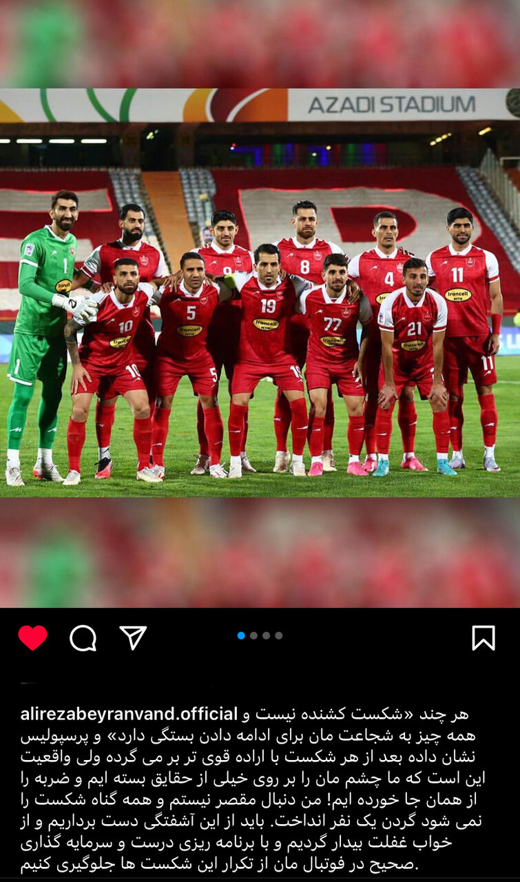 به گزارش خبرداغ به نقل از خبرآنلاین؛ علیرضا بیرانوند، دروازهبان تیم پرسپولیس با انتشار پستی در صفحه اینستاگرام خود به شکست مقابل النصر واکنش نشان داد.