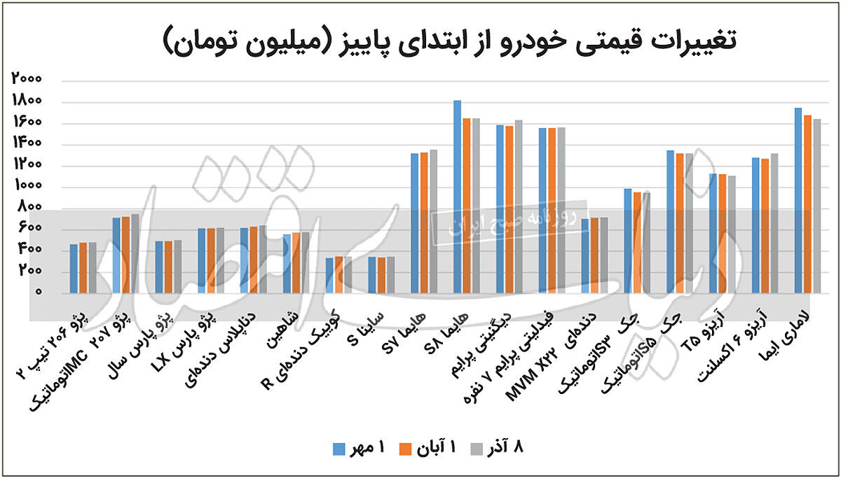 به هر صورت بیشترین رشد قیمت محصولات داخلی مربوط به پژو 207 MC اتوماتیک بوده که اول مهرماه 715میلیون تومان خرید و فروش میشد اما بهای آن در اول آبانماه به 725میلیون تومان رسیده و روز گذشته نیز 750میلیون تومان در بازار قیمتگذاری شد تا 4.9درصد افزایش قیمت را در این مدت ثبت کند. دناپلاس دندهای نیز در این بازه زمانی رشد قیمت محسوسی داشته و بهای آن از 620میلیون تومان در ابتدای مهرماه و 630میلیون تومان در اول آبان، روز گذشته به 643میلیون تومان رسید تا 23میلیون تومان، معادل 3.7درصد، رشد قیمت را ثبت کند. کمترین افزایش بها بین محصولات داخلی نیز مربوط به ساینا S است که قیمت آن روز ابتدایی پاییز 345میلیون تومان بود اما در ابتدای آبان به 340میلیون تومان کاهش یافت و سپس 8 آذر 348میلیون تومان خرید و فروش شد؛ بنابراین این محصول تنها 0.8درصد رشد قیمت را ثبت کرده است.