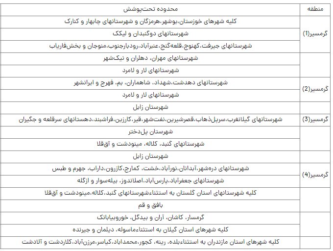 برای مناطق گرمسیر ۱، ۲، ۳ و ۴ نیز مقدار مصرف الگو بهترتیب برابر با ۲۵۰۰، ۱۵۰۰، ۶۰۰ و ۴۵۰ کیلوواتساعت است و مصرف تا سقف مقادیر ذکر شده با تعرفه عادی محاسبه خواهد شد.