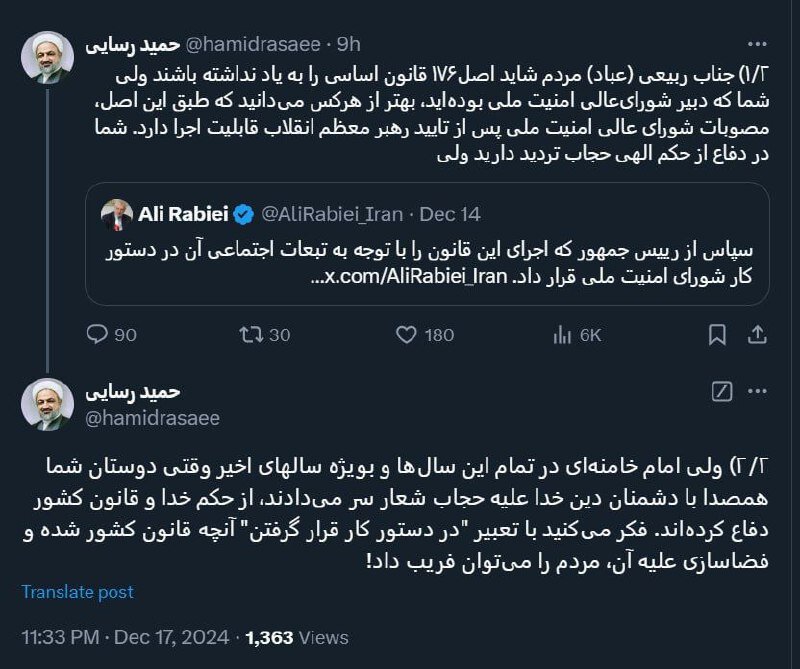 جناب ربیعی (عباد) مردم شاید اصل ۱۷۶ قانون اساسی را به یاد نداشته باشند ولی شما که دبیر شورای عالی امنیت ملی بوده اید، بهتر از هر کس می دانید که طبق این اصل، مصوبات شورای عالی امنیت ملی پس از تایید رهبر معظم انقلاب قابلیت اجرا دارد. شما در دفاع از حکم الهی حجاب تردید دارید ولی امام خامنه ای در تمام این سالها و بویژه سالهای اخیر وقتی دوستان شما همصدا با دشمنان دین خدا علیه حجاب شعار سر می دادند از حکم خدا و قانون کشور دفاع کرده اند. فکر می کنید با تعبیر در دستور کار قرار گرفتن آنچه قانون کشور شده و فضاسازی علیه آن، مردم را می توان فریب داد!