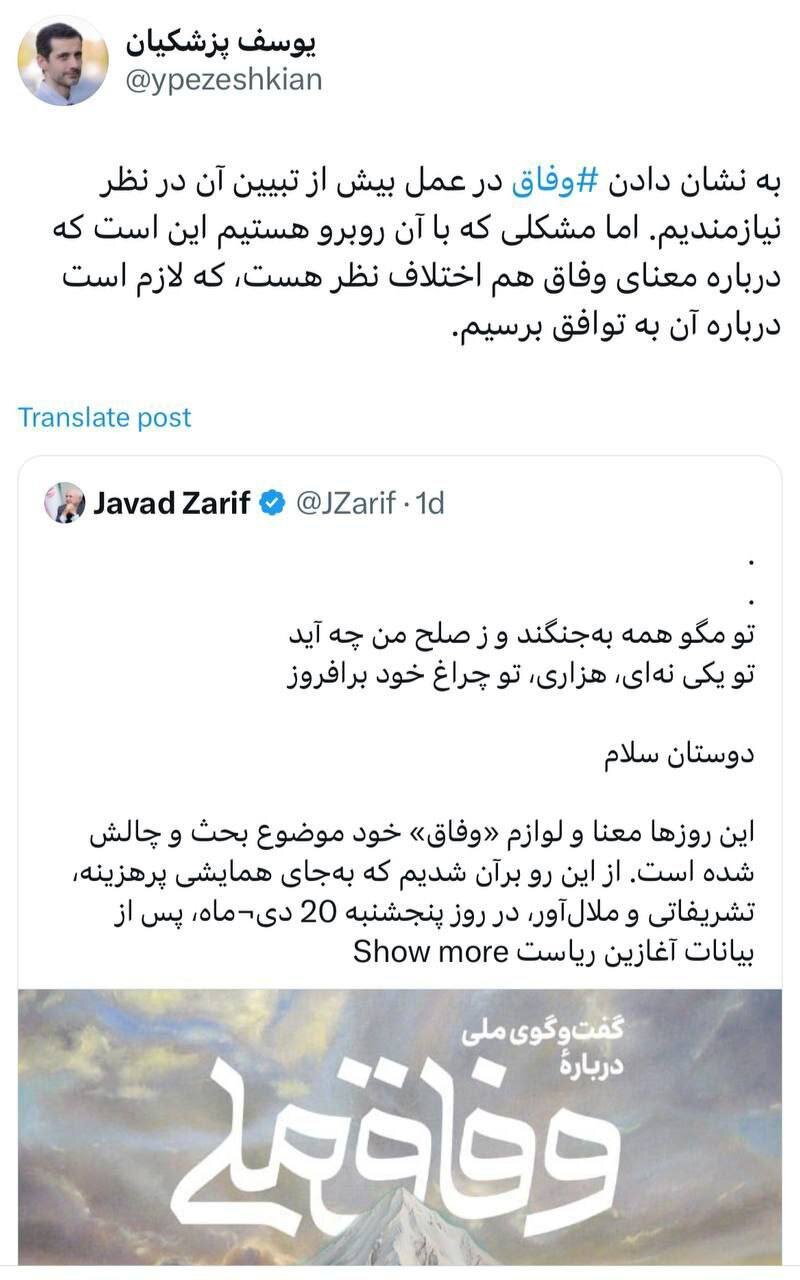 یوسف پزشکیان در واکنش به این توئیت نوشته است؛