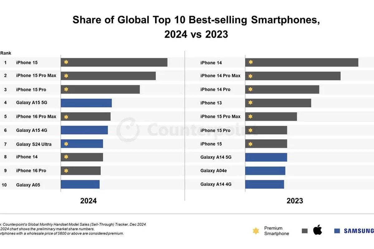 از میان مدلهای سامسونگ، گلکسی A۱۵ ۴G توانست در جایگاه چهارم فهرست ۱۰ گوشی پرفروش سال جای بگیرد و گلکسی S۲۴ اولترا نیز پس از آیفون ۱۶ پرو مکس و گلکسی A۱۵ ۵G، در رتبه هفتم قرار گرفت.