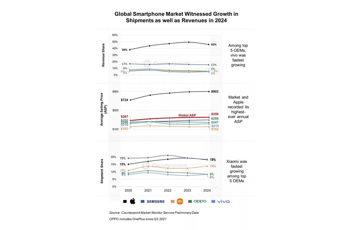 براساس جدیدترین گزارش «Counterpoint Research»، درآمد جهانی گوشیهای هوشمند در سال ۲۰۲۴، ۵ درصد رشد سالانه را تجربه کرد و میانگین قیمت فروش (ASP) به ۳۵۶ دلار رسید که رکوردی جدید محسوب میشود. این افزایش درآمد نشاندهنده تمایل بیشتر کاربران به خرید گوشیهای پریمیوم است.