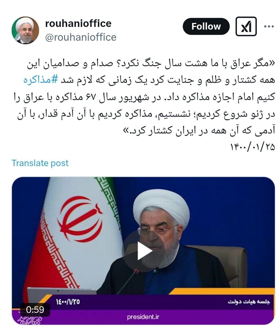 به گزارش خبرداغ به نقل از خبرآنلاین؛ حجت الاسلام و المسلمین حسن روحانی، بخشی از سخنان خود در جلسه هیات دولت در تاریخ ۲۵ فروردین ماه ۱۴۰۰ را در شبکه اجتماعی ایکس منتشر کرده است که در آن می گوید: