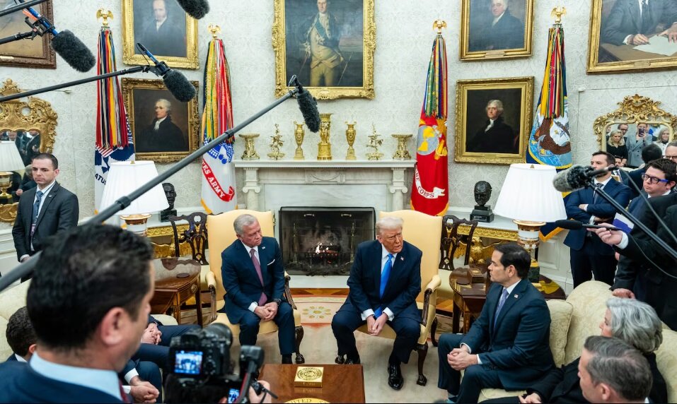 در هیاهوی بلوایی که ترامپ در این عصر تاریخی به راه انداخته است شاه اردن در اتاق بیضی به سکوت گذراند و تنها یک پاس گل به اعراب داد و اتاق را ترک گفت! تمام مدت این تاجر قلدر برای دوربین ها صحبت کرد.آیا این شاه کارکشته عربی سیاس عمل کرد یا سکوتش از رضایت بود و دلش اهل شکایت نبود؟!