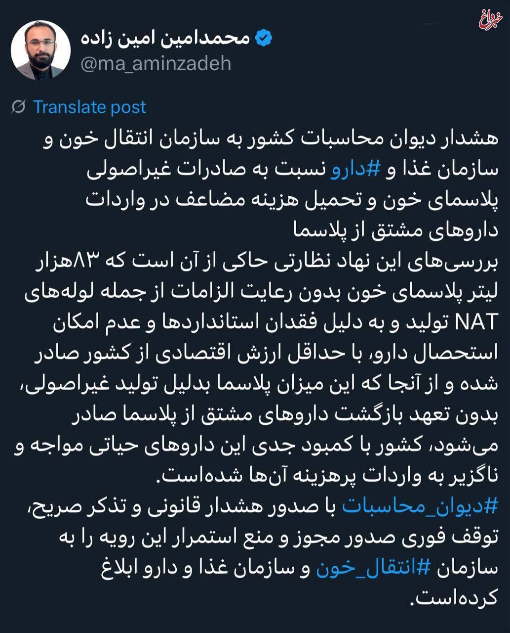 محمدامین امین زاده:بررسیهای این نهاد نظارتی حاکی از آن است که۸۳هزار لیتر پلاسمای خون بدون رعایت الزامات ازجمله لولههای NATتولید و به دلیل فقدان استانداردها وعدم امکان استحصال دارو، با حداقل ارزش اقتصادی ازکشور صادرشده و ازآنجا که این میزان پلاسما بدلیل تولید غیراصولی، بدون تعهد بازگشت داروهای مشتق از پلاسما صادرمیشود،کشور باکمبود جدی این داروهای حیاتی مواجه و ناگزیربه واردات پرهزینه آنها شدهاست.