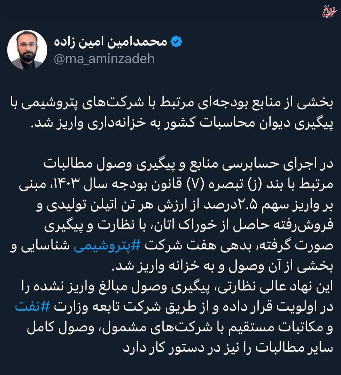 حسابرس کل دیوان محاسبات: در اجرای حسابرسی منابع و پیگیری وصول مطالبات مرتبط با بند (ز) تبصره (۷) قانون بودجه سال ۱۴۰۳، مبنی بر واریز سهم ۲.۵درصد از ارزش هر تن اتیلن تولیدی و فروش‌رفته حاصل از خوراک اتان، با نظارت و پیگیری صورت گرفته، بدهی هفت شرکت ‌ #پتروشیمی⁩ شناسایی و بخشی از آن وصول و به خزانه واریز شد.