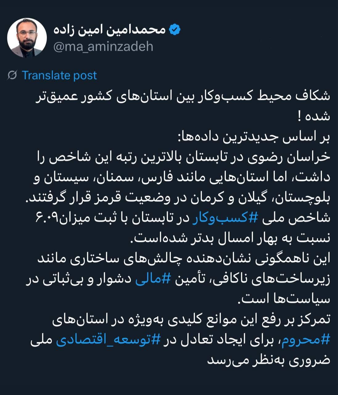 محمدامین امین زاده کارشناس مسائل اقتصادی در صفحه پیام رسان اکس(توییتر سابق) خود نوشت که بر اساس جدیدترین دادهها: