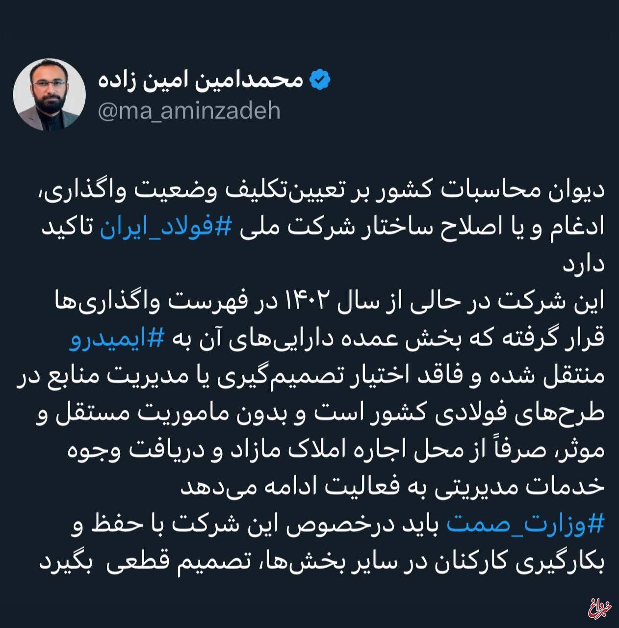 حسابرس کل دیوان محاسبات: دیوان محاسبات کشور بر تعیینتکلیف وضعیت واگذاری، ادغام و یا اصلاح ساختار شرکت ملی فولاد ایران تاکید دارد