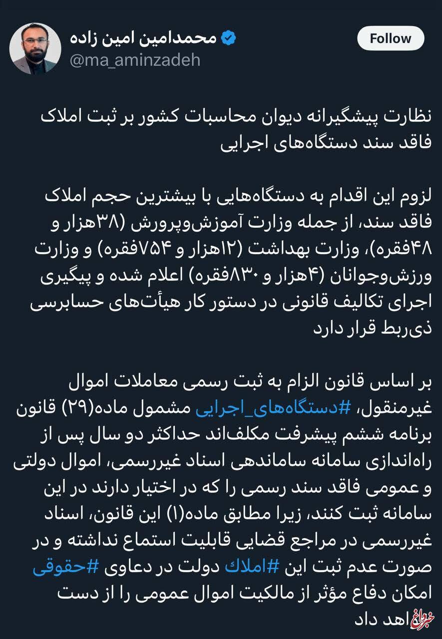حسابرس کل دیوان محاسبات: لزوم این اقدام به دستگاههایی با بیشترین حجم املاک فاقد سند، از جمله وزارت آموزشوپرورش (۳۸هزار و ۴۸فقره)، وزارت بهداشت (۱۲هزار و ۷۵۴فقره) و وزارت ورزشوجوانان (۴هزار و ۸۳۰فقره) اعلام شده و پیگیری اجرای تکالیف قانونی در دستور کار هیأتهای حسابرسی ذیربط قرار دارد.