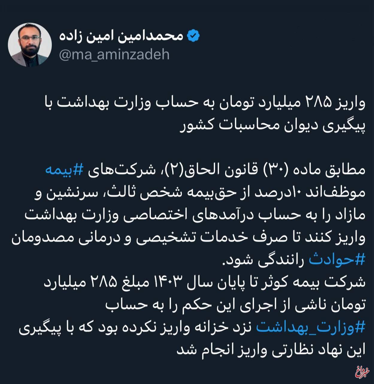 محمدامین امین زاده: شرکت بیمه کوثر تا پایان سال ۱۴۰۳ مبلغ ۲۸۵ میلیارد تومان ناشی از اجرای این حکم را به حساب #وزارت_بهداشت نزد خزانه واریز نکرده بود که با پیگیری این نهاد نظارتی واریز انجام شد